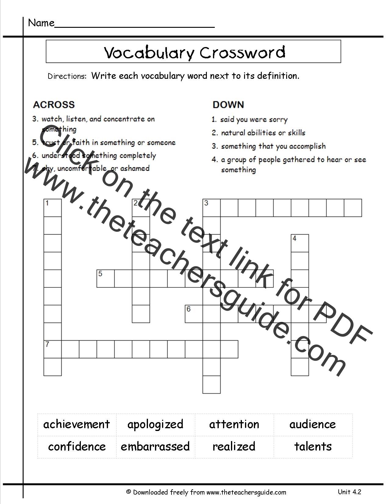 Vocabulary Crossword Printable 4th Grade